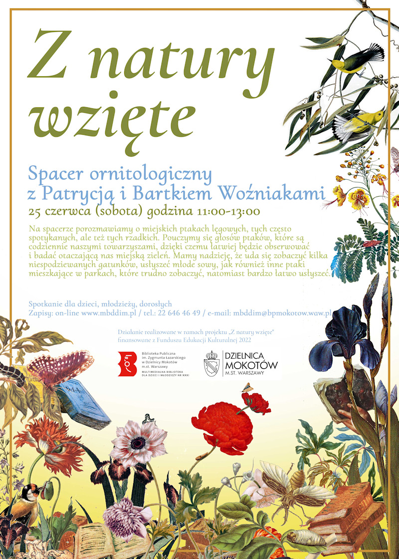 Projekt „Z natury wzięte” to cykl przedsięwzięć edukacyjno-artystycznych, których celem jest zachęcenie dzieci i młodzieży do uważnego oglądania, słuchania, poznawania natury, prowokowania do refleksji. Projekt jest realizowany od czerwca do września i zakłada organizację spotkań z twórcami książek, warsztaty, spacery po okolicy.