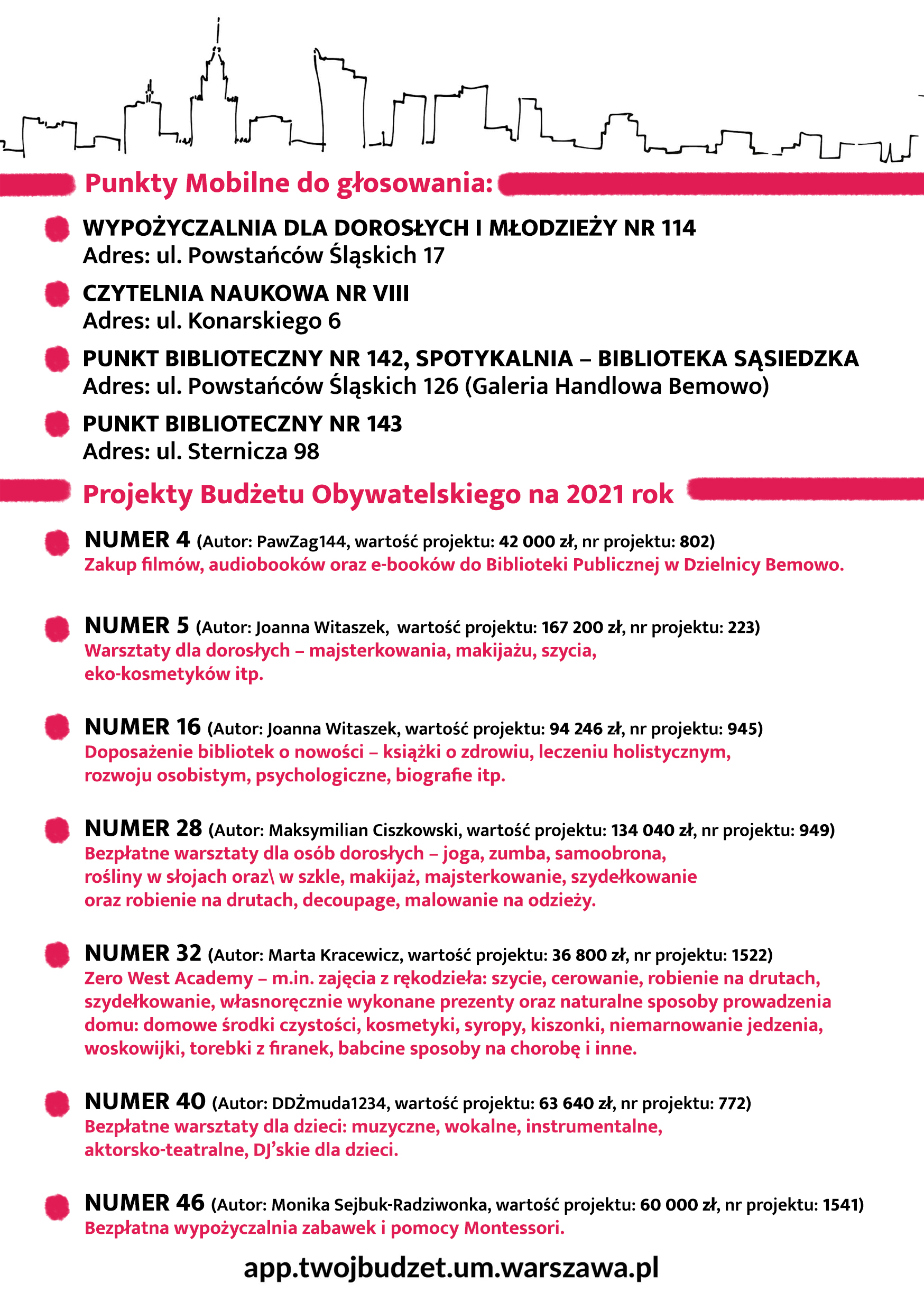 Zachęcamy do głosowania na projekty z budżetu obywatelskiego 2021 związane z Biblioteką Publiczną na Bemowie. Każdy głos się liczy i jest dla nas ważny – bo może zdecydować o tym, jakie warsztaty i zajęcia będziemy mogli zaproponować naszym Czytelnikom w następnym roku. Wśród propozycji związanych z bemowską Biblioteką, zgłoszonych przez mieszkańców w ramach BO na rok 2021 są m.in. akademia zero waste, wypożyczalnia zabawek i pomocy Montessori, warsztaty rękodzielnicze dla dorosłych oraz artystyczne dla dzieci, zakup nowości oraz e-nowości do naszych wypożyczalni.