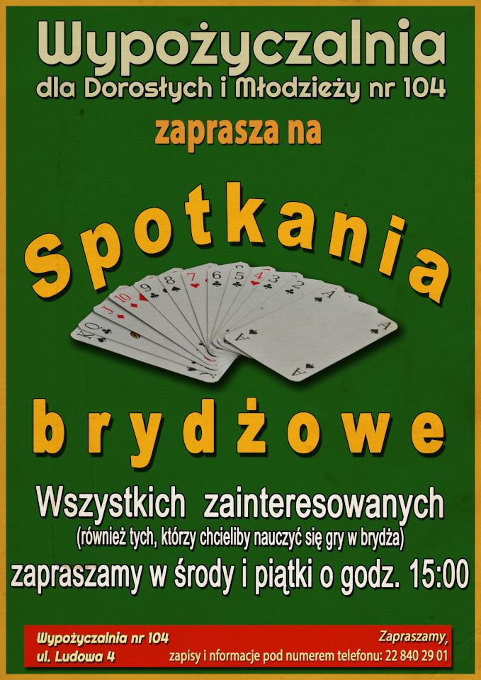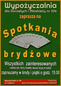 Pragniemy zaprosić Cię na Spotkania Brydżowe w Wypożyczalni 104.
