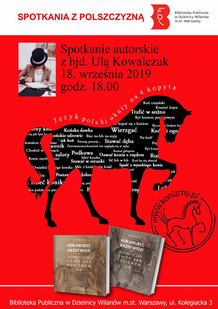 Celem wykładów jest przybliżenie uczestnikom zagadnień rodzimego języka. Zapraszamy wszystkich sympatyków polszczyzny i żądnych wiedzy. Rozpoczynamy wykładem Uli Kowalczuk „Język polski okuty na 4 kopyta„. Autorka książki „Koń jaki jest każdy widzi – czyli alfabetyczny zbiór 300 konizmów” przypomi nam, że „Lach bez konia to jak ciało bez duszy”. Będziemy mogli posłuchać o tym, jak konizmy zadomowiły się i zdominowały nasz język i kulturę. W końcu „konia z rzędem” temu, kto nigdy nie użył konizmu.