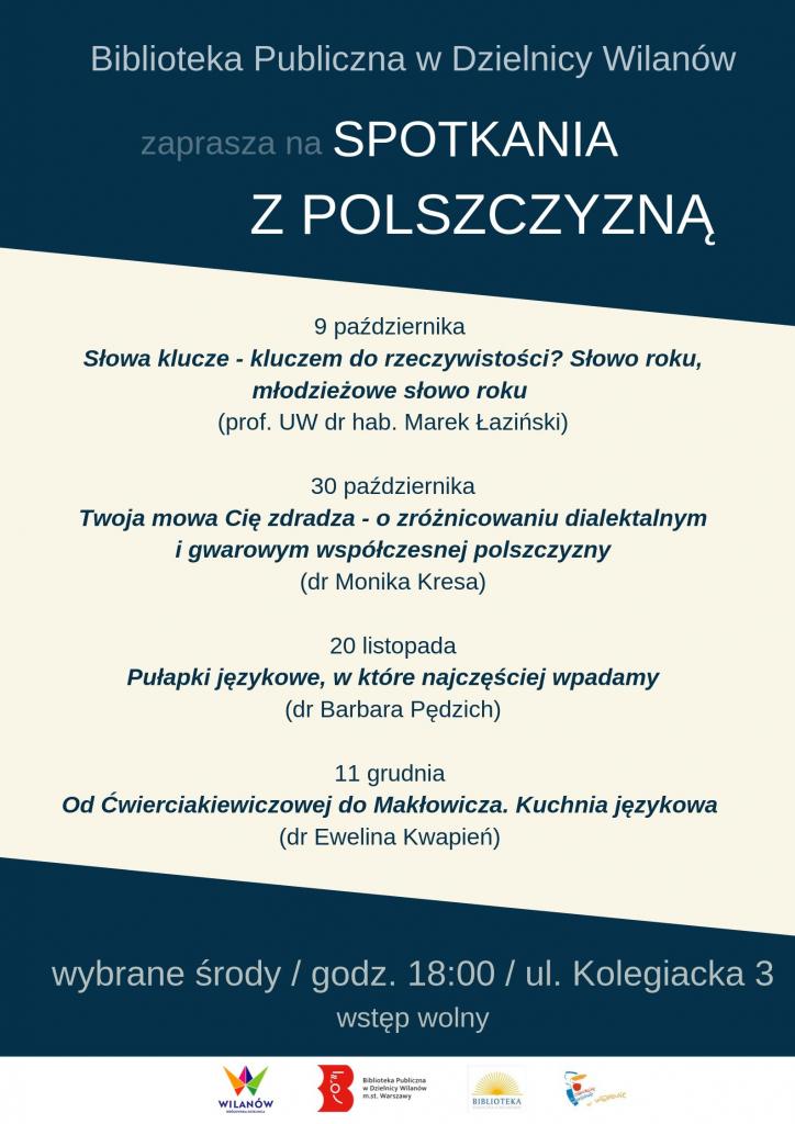 Wielką sztuką jest umiejętność pięknego i poprawnego posługiwania się ojczystym językiem. Sprawnego formułowania myśli, oddawania emocji, dostosowywania komunikatów do sytuacji. Z myślą o rozwoju kompetencji językowych Czytelników zapraszamy wszystkich sympatyków języka polskiego i żądnych językowej wiedzy na cykl wykładów „Spotkania z polszczyzną”.