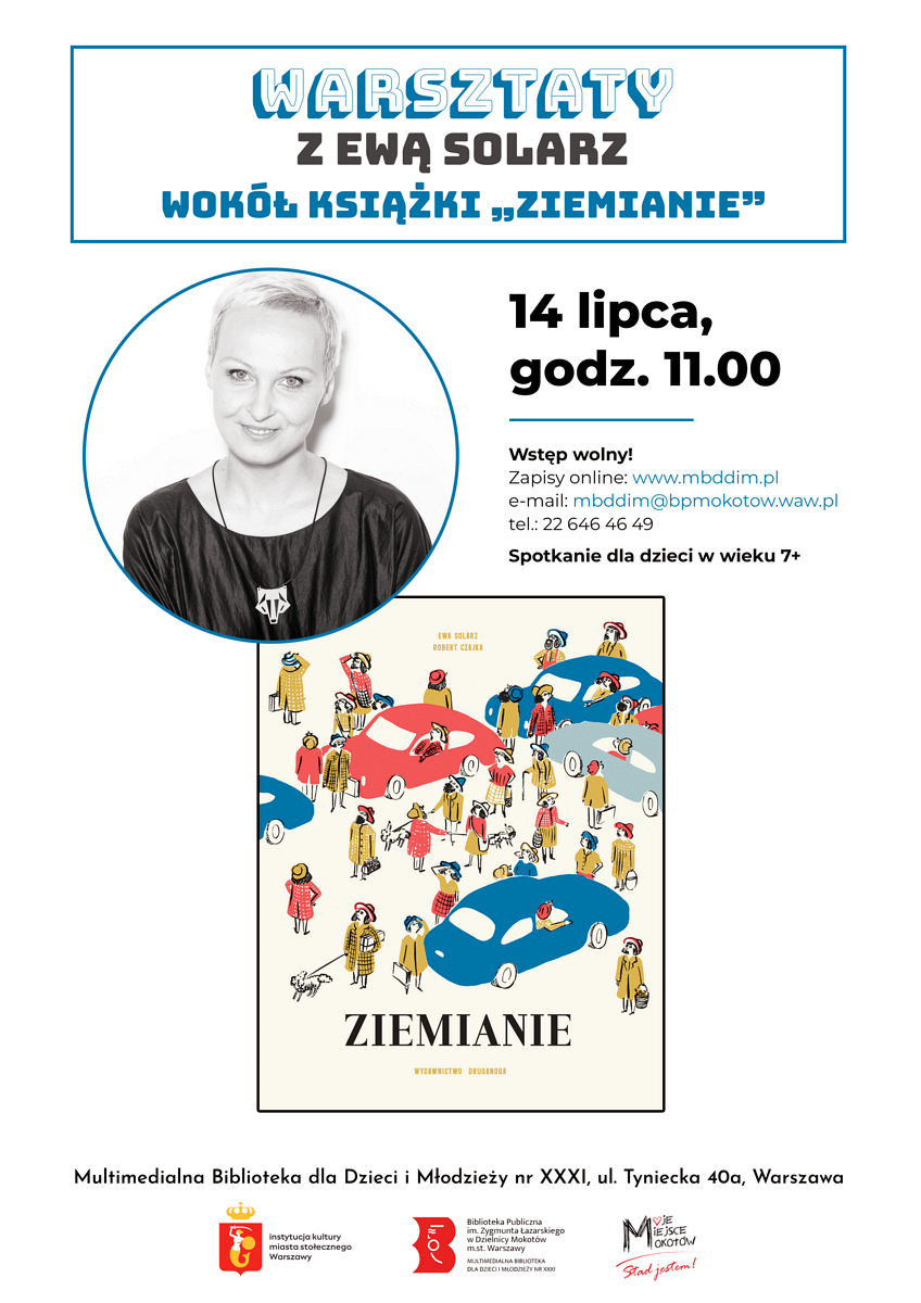 Multimedialna Biblioteka dla Dzieci i Młodzieży nr XXXI zaprasza na spotkanie autorskie i warsztaty z Ewą Solarz wokół książki „Ziemianie”.