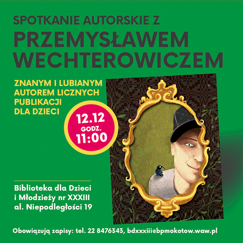 Mokotowska Biblioteka przy metrze Wilanowska zaprasza na spotkanie z Przemysławem Wechterowiczem, pisarzem i autorem książek obrazkowych. Debiutował ilustrowaną książką o sporych wymiarach „Wielkie marzenia” (2008). Opublikował ponad 40 książek przetłumaczonych na ponad 20 języków. Za „Proszę mnie przytulić” został uhonorowany Nagrodą Literacką m.st. Warszawy (2014).