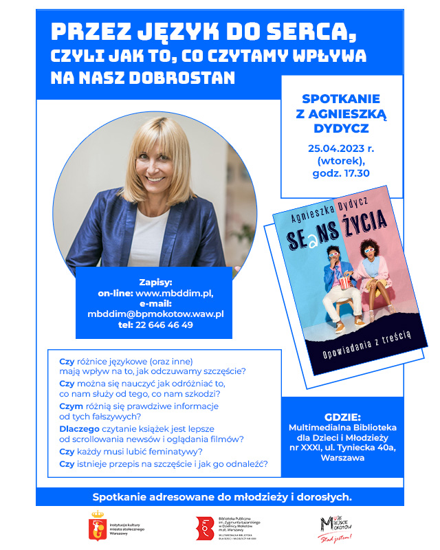 25 kwietnia o godzinie 17:30 zapraszamy na spotkanie pt. „Przez język do serca, czyli jak to, co czytamy wpływa na nasz dobrostan”. O wpływie języka na nasze szczęście opowie Agnieszka Dydycz, pisarz z wyboru, finansista z wykształcenia i doświadczenia, prawie mgr inż. budownictwa, certyfikowany tutor, mentor i coach, członek rady ekspertów THINK TANK, praktyk dobrego życia.