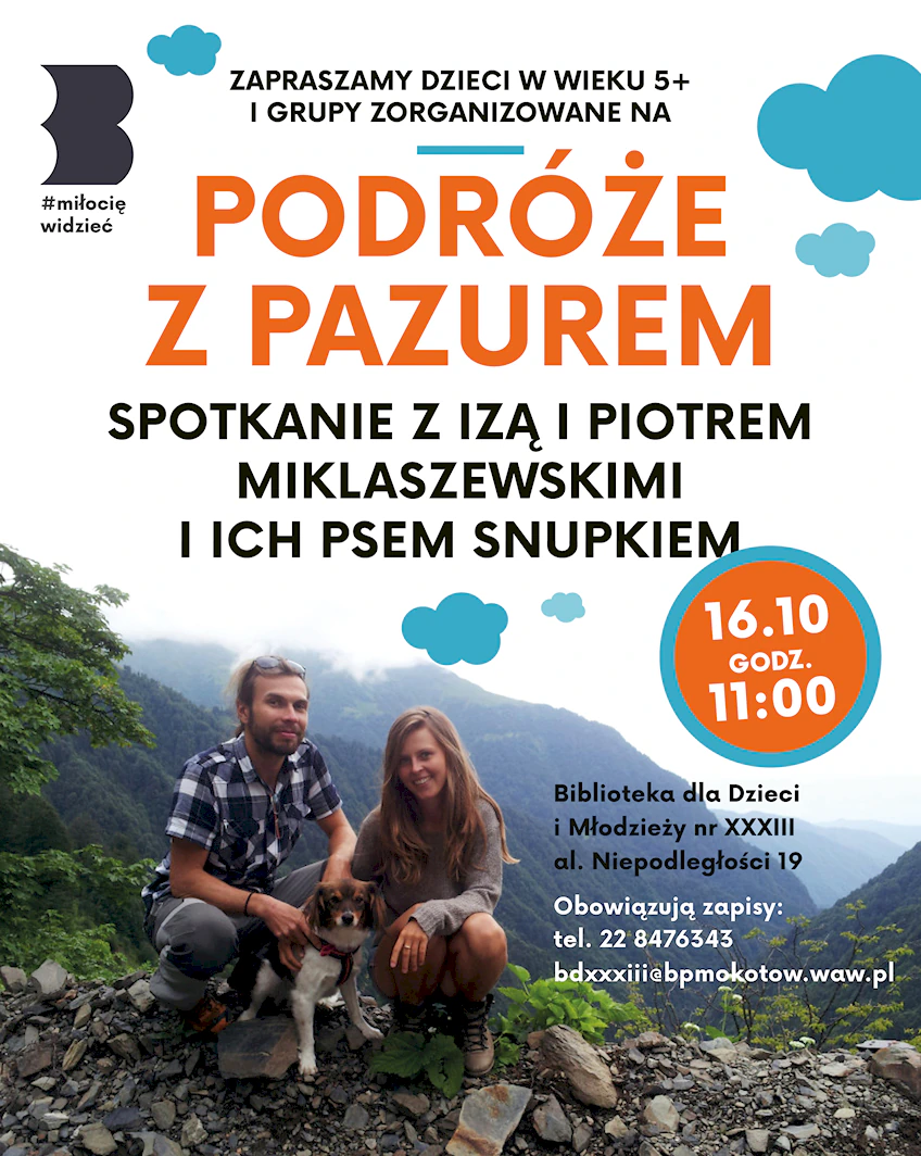 Mokotowska biblioteka zaprasza na lekcję przygodowo-edukacyjną: „Podróże z pazurem” – Iza i Piotr Miklaszewscy wraz z psem Snupkiem.