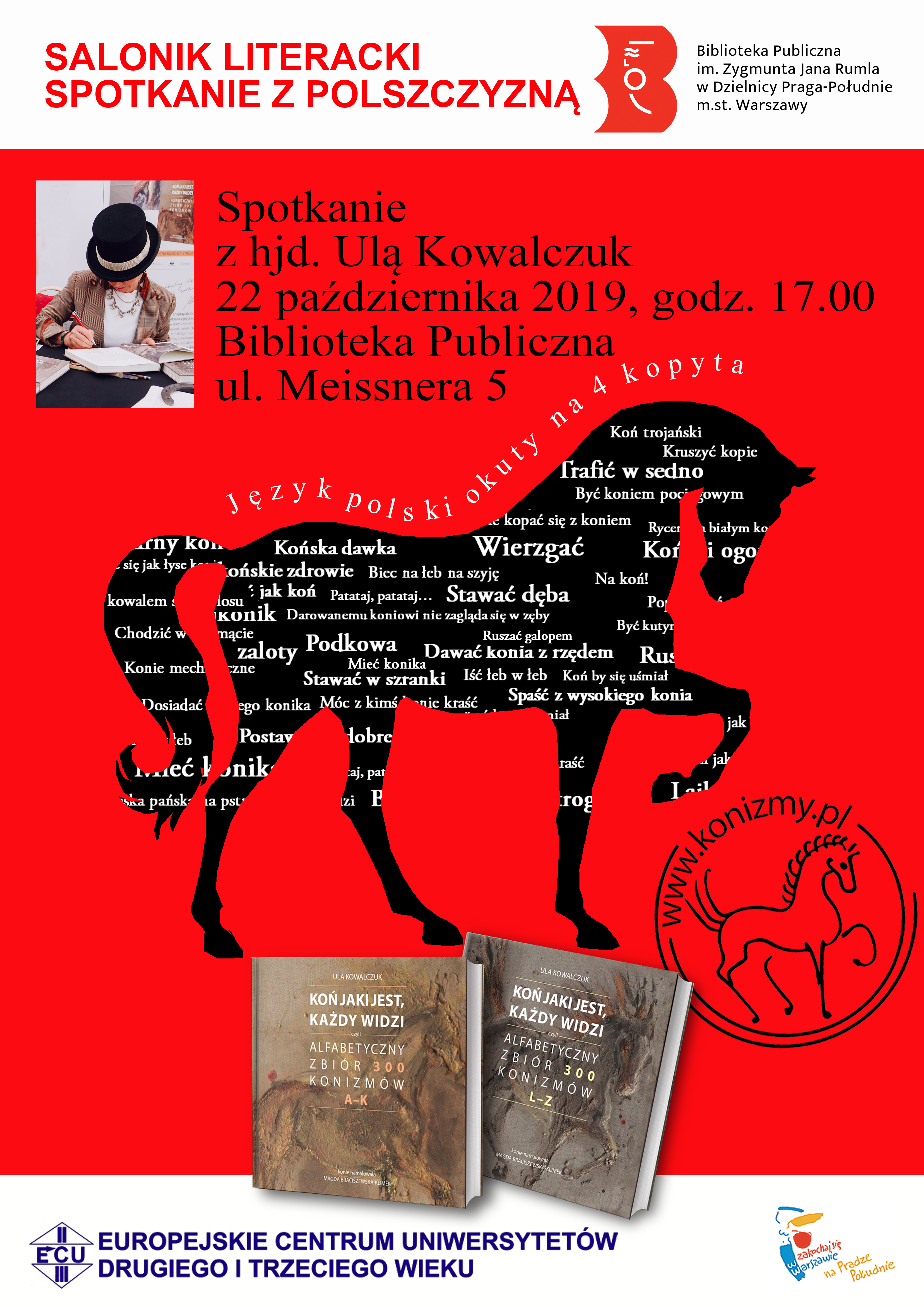 Biblioteka Publiczna im. Zygmunta Jana Rumla w Dzielnicy Praga-Południe oraz Europejskie Centrum Uniwersytetów Drugiego i Trzeciego Wieku zapraszają we wtorek, 22 października o godzinie 17:00, na spotkanie z cyklu Salonik Literacki. Pierwszym gościem w nowym roku akademickim będzie autorka książek „Koń jaki jest, każdy widzi czyli alfabetyczny spis konizmów”, Ula Kowalczuk.