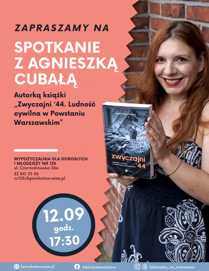 Zapraszamy na spotkanie z Agnieszką Cubałą, autorką książki „Zwyczajni’44. Ludność cywilna w Powstaniu Warszawskim”. Pisarka jest pasjonatką historii Powstania Warszawskiego.