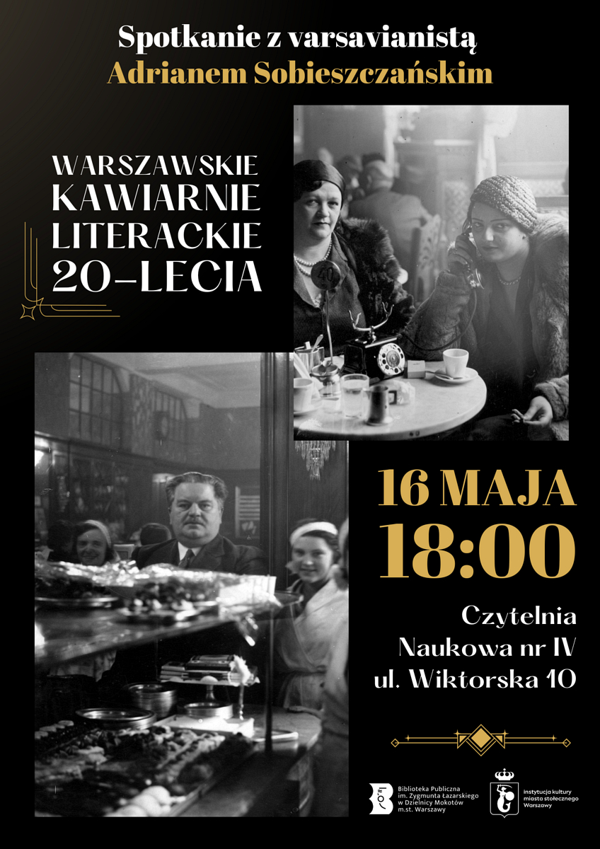 Na czarnym tle rozrzucone są dwa zdjęcia czarnobiałe z lat dwudziestych dwudziestego wieku. Na jednym dwie panie siedzą przy stoliku zastawionym filiżankami kawy i telefonem. Na drugim gablotka ze słodyczami, a za nią fragment kawiarenki oraz kilka osób. Do tego tekst zawarty w tekście.