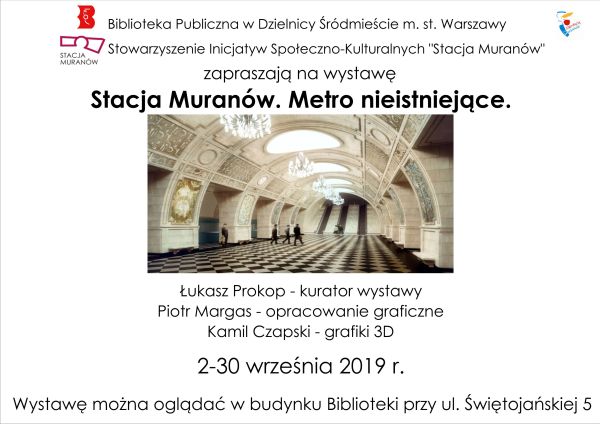 Biblioteka Publiczna w Dzielnicy Śródmieście m.st. Warszawy oraz Stowarzyszenie Inicjatyw Społeczno – Kulturalnych „Stacja Muranów”, zapraszają na wystawę pt.: „Stacja Muranów. Metro nieistniejące”.