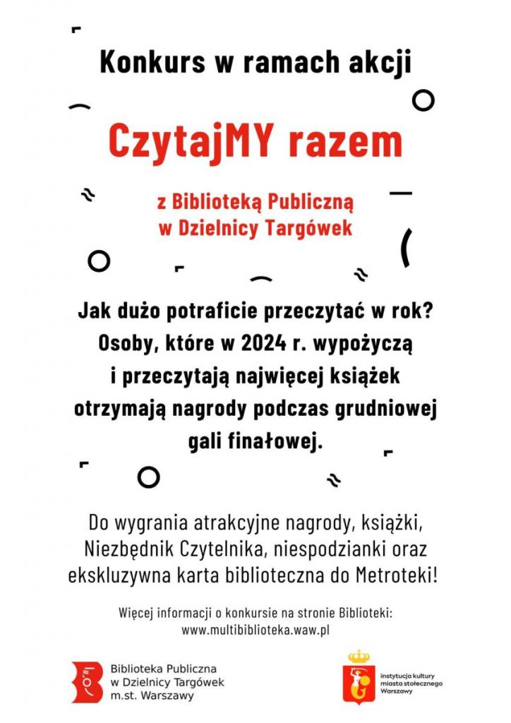 Rzucamy Wam wyzwanie czytelnicze – co miesiąc minimum jedna wypożyczona książka! Wiemy, że dla wielu z Was to pikuś, bo 200 stron „łykacie” w jeden dzień, więc… organizujemy również konkurs! Osoby, które w 2024 r. wypożyczą w placówkach na Targówku najwięcej książek, otrzymają wspaniałe zestawy prezentowe, zawierające m.in. Niezbędnik Czytelnika, atrakcyjne nagrody-niespodzianki, ekskluzywną kartę biblioteczną Metroteki (biblioteki w metrze, którą na wiosnę otwieramy) i oczywiście książki. Więcej informacji: w regulaminie.