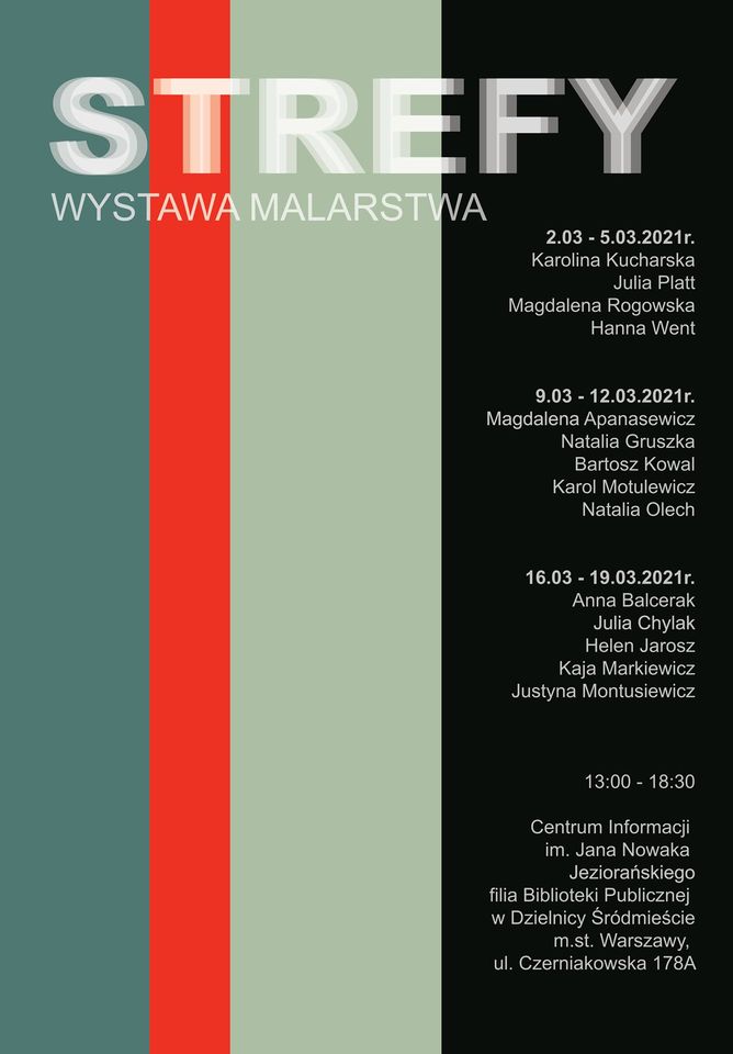 Biblioteka Publiczna w Dzielnicy Śródmieście m.st. Warszawy zaprasza do Wypożyczalni dla Dorosłych i Młodzieży nr 97 i Centrum Informacji im. Jana Nowaka-Jeziorańskiego przy ul. Czerniakowskiej 178a na wystawę malarstwa studentów warszawskiej ASP, pt.: „Strefy”.