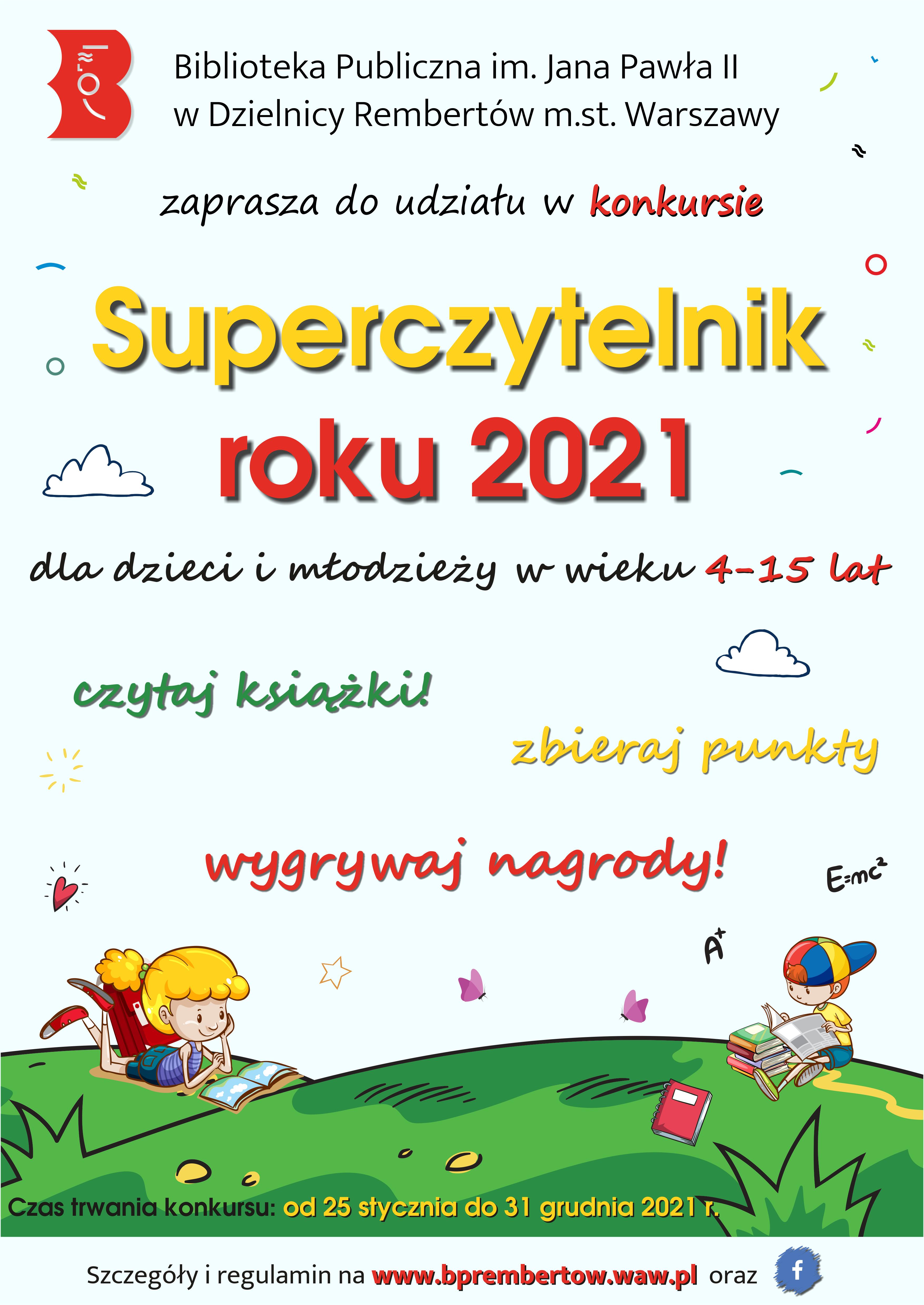 Masz od 4 do 15 lat? Lubisz książki i nutkę rywalizacji? Weź udział w kolejnej edycji konkursu na Superczytelnika roku . Konkurs potrwa do 31 grudnia 2021 roku. Superczytelnikami w trzech kategoriach wiekowych zostaną osoby, które wypożyczą i przeczytają najwięcej książek. Na zwycięzców czekają nagrody. Czytaj, odwiedzaj bibliotekę, zbieraj punkty, baw się!