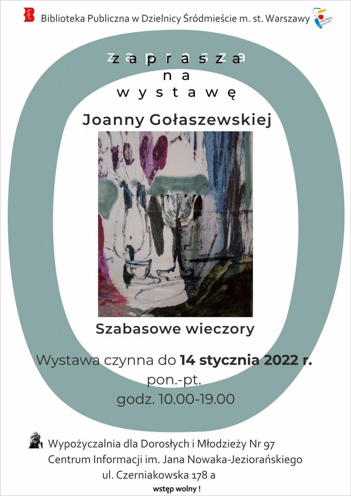 Biblioteka Publiczna w Dzielnicy Śródmieście m.st. Warszawy zaprasza do Wypożyczalni dla Dorosłych i Młodzieży nr 97 i Centrum Informacji im. Jana Nowaka-Jeziorańskiego przy ul. Czerniakowskiej 178a na wystawę Joanny Gołaszewskiej pt.: „Szabasowe wieczory”.
