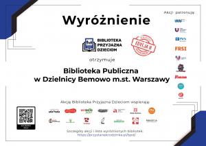 Biblioteka Publiczna im. Zygmunta Jana Rumla w Dzielnicy Praga-Południe m.st. Warszawy otrzymała certyfikat Biblioteki Przyjaznej Dzieciom.