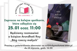 Mokotowski Dyskusyjny Klub Książki na Ludowej zaprasza na kolejne spotkanie, które odbędzie się 25 stycznia w pomieszczeniach wypożyczalni na Ludowej 4. Będziemy rozmawiać o książce Arundhati Roy „Bóg rzeczy małych”.