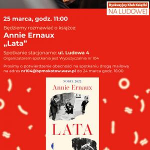 Dyskusyjny Klub Książki na Ludowej 4 zaprasza 25 marca na godz. 11:00 na rozmowę o książce Annie Ernaux „Lata”.