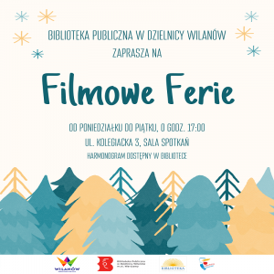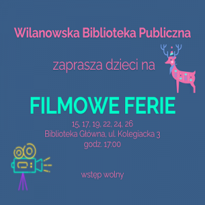 Od poniedziałku do piątku, w ferie o godz. 17:00 Wilanowska Biblioteka Publiczna zaprasza na niezapomniane pokazy filmowe w ramach „Filmowych ferii”.
