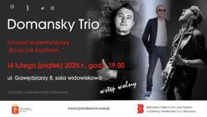 Już 14 lutego o godz. 19.00 zapraszamy do rembertowskiej biblioteki przy ul. Gawędziarzy 8 na koncert walentynkowy zespołu Domansky Trio. Wstęp na koncert jest wolny.