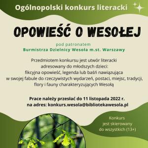 Zapraszamy do udziału w ogólnopolskim konkursie literackim organizowanym z okazji 20-lecia włączenia Wesołej do miasta stołecznego Warszawy. Na zwycięzców czekają atrakcyjne nagrody!