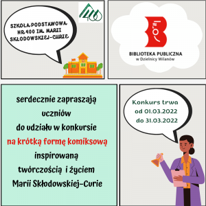 Biblioteka Publiczna w Dzielnicy Wilanów oraz SP nr 400 im. Marii Skłodowskiej-Curie zachęcają do wzięcia udziału w konkursie na komiks o życiu noblistki.