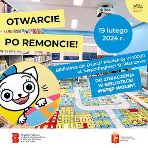 19 lutego otwieramy po remoncie Bibliotekę dla Dzieci i Młodzieży nr XXXIII przy al. Niepodległości 19. Przyłączcie się do nas i spędźcie ten dzień w bibliotece.