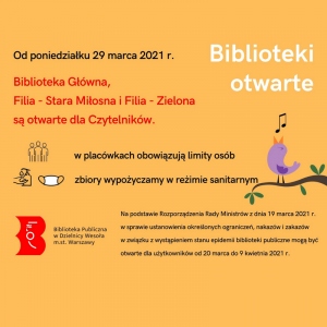 Od poniedziałku 29 marca 2021 r. otwarte są dla Czytelników Biblioteka Główna, Filia w Starej Miłośnie i Filia w Zielonej.