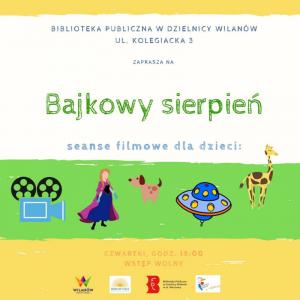 W czwartki o godzinie 18:00 Biblioteka w Wilanowie zaprasza na ul. Kolegiacką 3 na „Bajkowy sierpień” czyli pokazy filmowe dla dzieci.