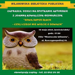 15 maja o godz. 17:30 filia Biblioteki w Miasteczku Wilanów zaprasza na spotkanie autorskie z Joanną Kowalczyk-Bednarczyk poświęcone sowom.
