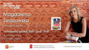 Spotkanie autorskie z Magdaleną Żelazowską odbędzie się 10 listopada (piątek) o godzinie 19 w sali widowiskowej Biblioteki Dz. Rembertów przy ul. Gawędziarzy 8.