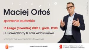 Maciej Orłoś będzie gościem biblioteki w Rembertowie 13 lutego o godz. 19.00. Spotkanie odbędzie się w sali widowiskowej biblioteki, przy ul. Gawędziarzy 8. Wstęp na wydarzenie jest wolny.