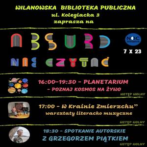 7 października od godz. 16:00 na Kolegiackiej 3 świętujemy IX Noc Bibliotek pod hasłem „Absurd nie czytać”. Czeka na Was moc atrakcji.