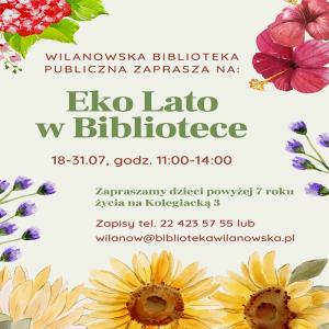 W dniach 18-22 oraz 25-29 lipca w godz. 11:00-14:00 Wilanowska Biblioteka Publiczna zaprasza dzieci do Biblioteki Głównej na „Eko lato w Bibliotece”.