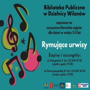 Biblioteka przy ul. Kolegiackiej 3 oraz filia w Miasteczku Wilanów zapraszają dzieci w wieku 3-5 lat na zajęcia muzyczno-literackie „Rymujące urwisy”.