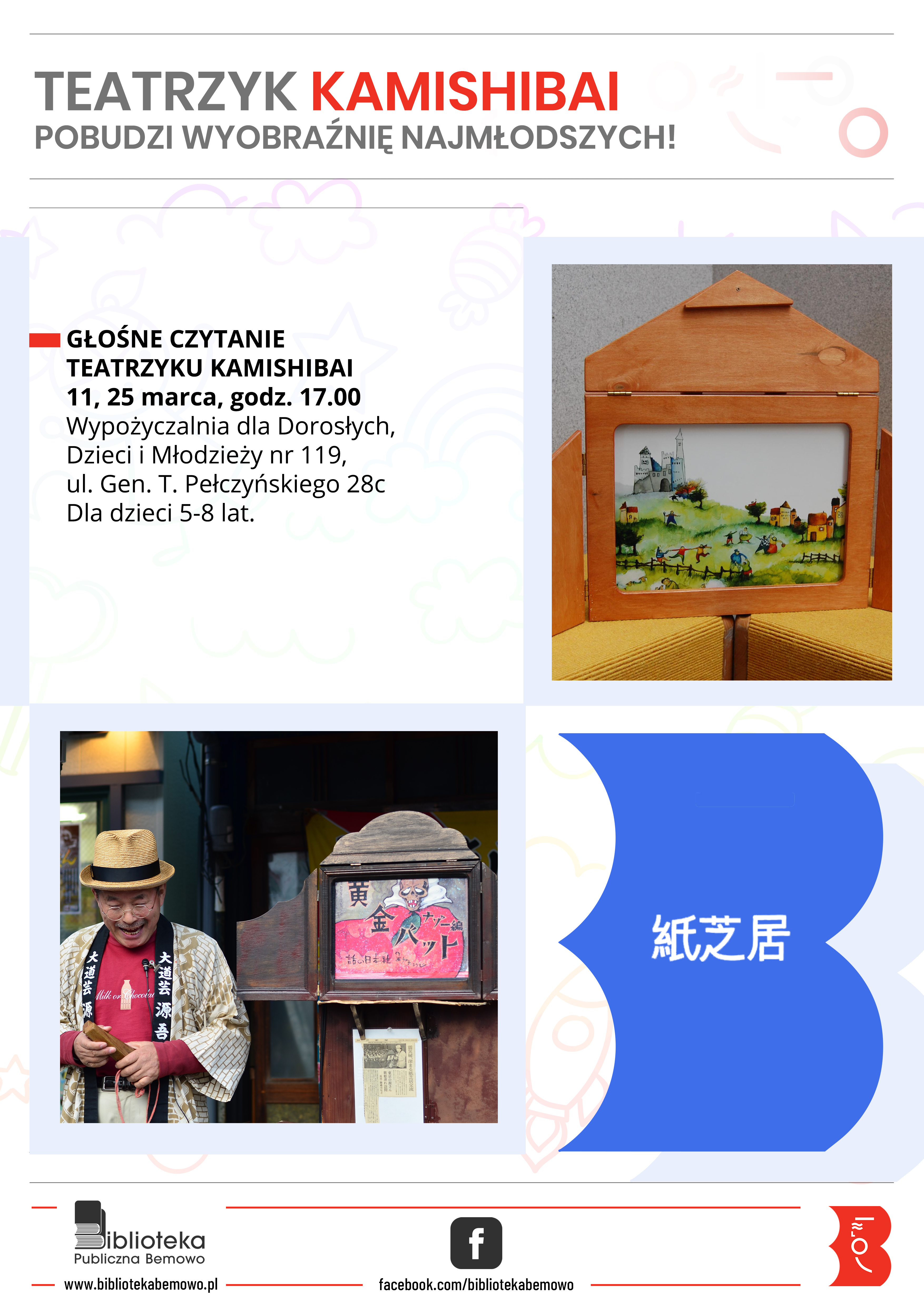 Kamishibai to technika czytania lub opowiadania, która pochodzi z Japonii. Dzięki wykorzystaniu plansz z obrazkami i tekstem oraz drewnianej skrzynce, opowiemy naszym młodym Czytelnikom niezapomniane historie.
