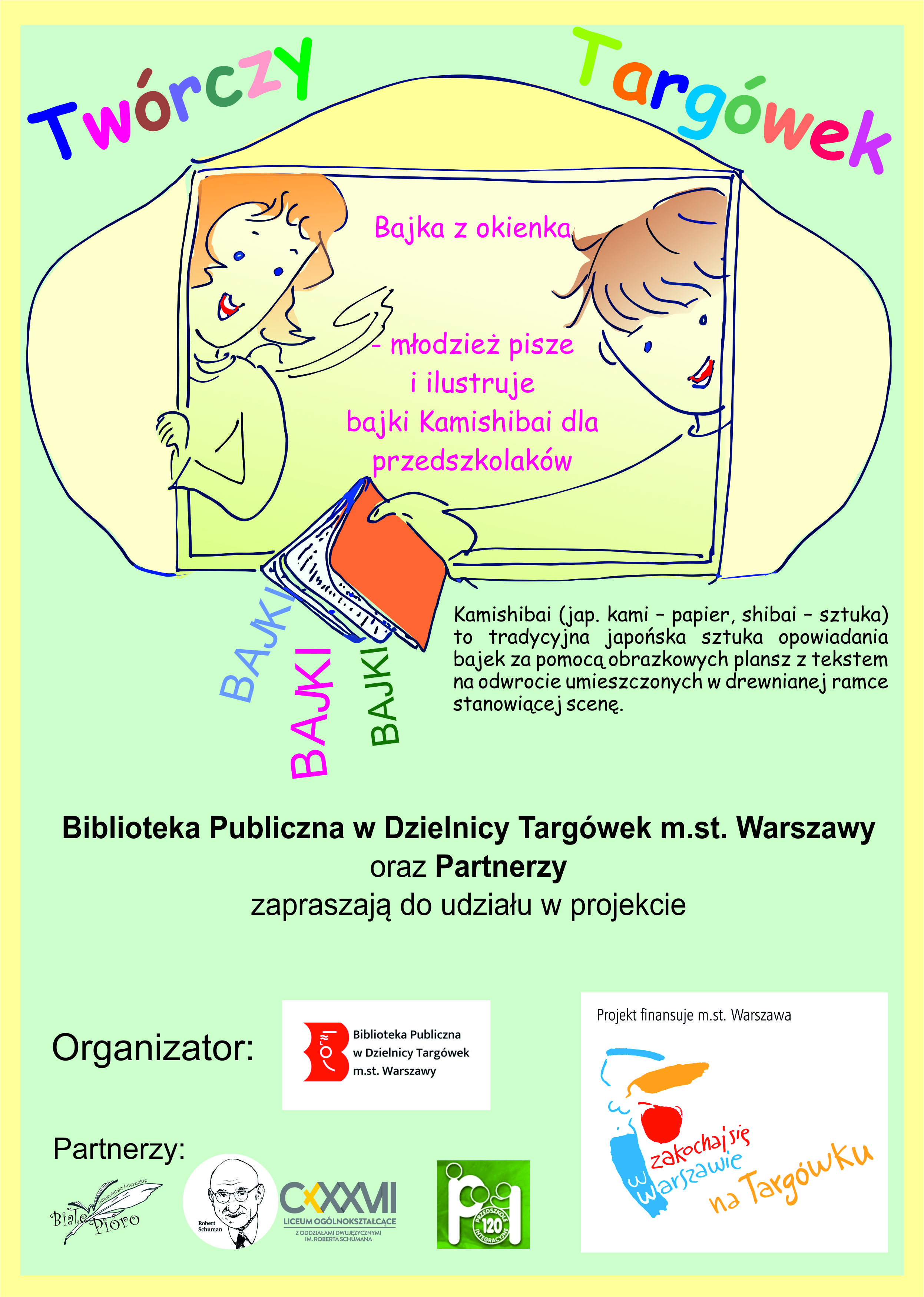 Projekt „Twórczy Targówek – bajka z okienka – młodzież pisze i ilustruje bajki Kamishibai dla przedszkolaków” realizowany jest przez Bibliotekę Publiczną w Dzielnicy Targówek m.st. Warszawy w partnerstwie z CXXXVII Liceum Ogólnokształcącym z Oddziałami Dwujęzycznymi im. Roberta Schumana, Przedszkolem Integracyjnym nr 120 oraz Wydawnictwem Literackim Białe Pióro.