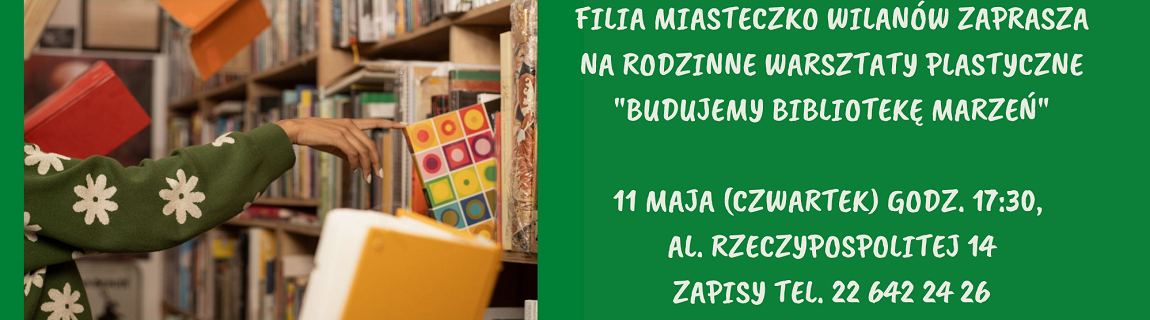 - czwartek 11 maja, godz. 17:30, filia Biblioteki w Miasteczku Wilanów, al. Rzeczypospolitej 14 Warsztaty plastyczne „Budujemy bibliotekę marzeń”