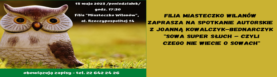 - poniedziałek 15 maja godz. 17:30, filia Biblioteki w Miasteczku Wilanów, al. Rzeczypospolitej 14 Spotkanie autorskie z Joanną Kowalczyk-Bednarczyk „Sowa super słuch – czyli czego nie wiecie o sowach”