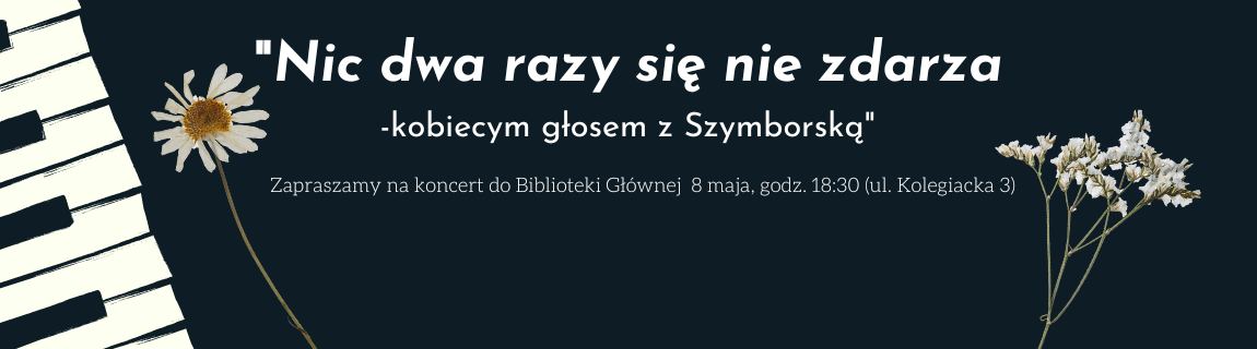 - poniedziałek 8 maja, godz. 18:30, Sala Spotkań Biblioteki, ul. Kolegiacka 3 Koncert „Nic dwa razy się nie zdarza – kobiecym głosem z Szymborską”