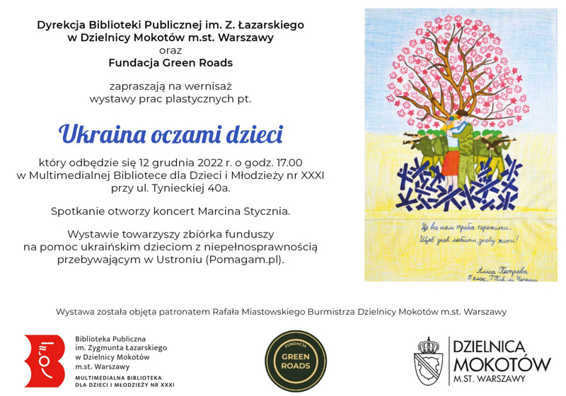 Każde dziecko zasługuje na spokojne niebo nad głową, szczęśliwe dzieciństwo i perspektywy na przyszłość. „Ukraina oczami dzieci” – to tytuł wyjątkowej i oryginalnej wystawy, którą będzie można oglądać w Multimedialnej Bibliotece dla Dzieci i Młodzieży nr XXXI (ul. Tyniecka 40a) od 12 grudnia 2022 r. do 31 stycznia 2023 r.