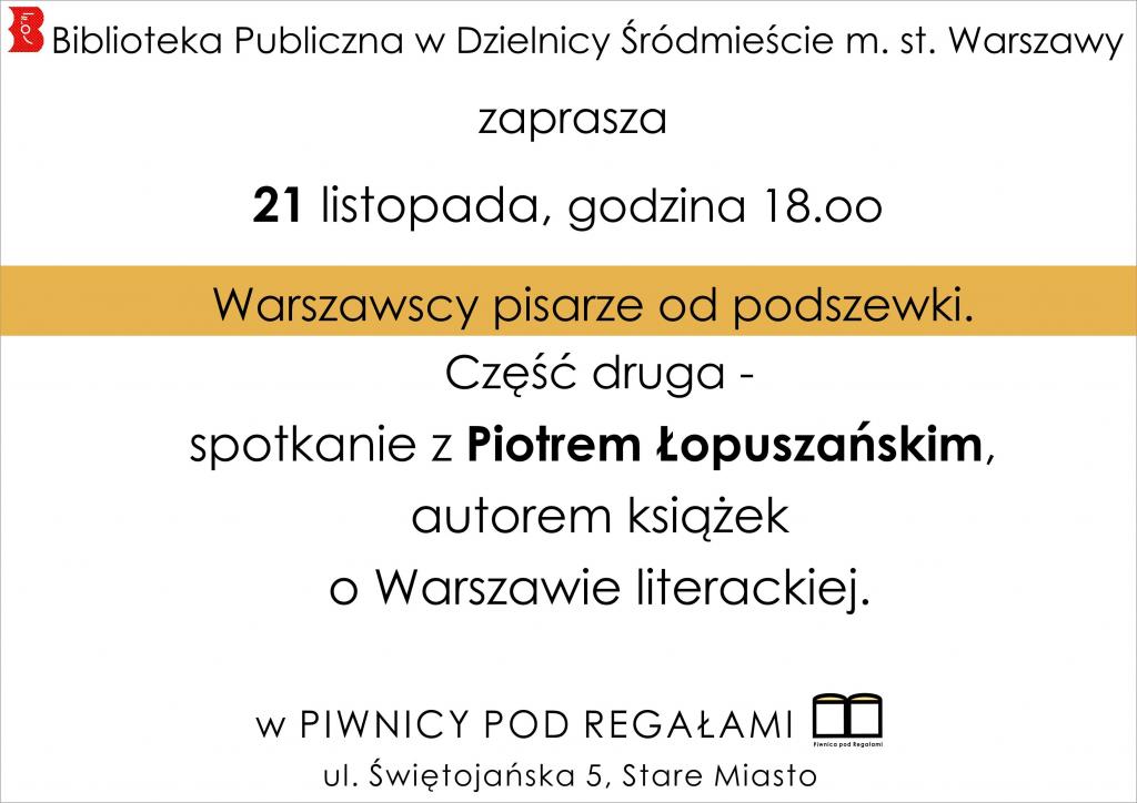 21 listopada o godzinie 18:00 w Piwnicy pod Regałami przy ul. Świętojańskiej 5, Piotr Łopuszański opowie o „Warszawskich pisarzach od podszewki, cz. 2”.