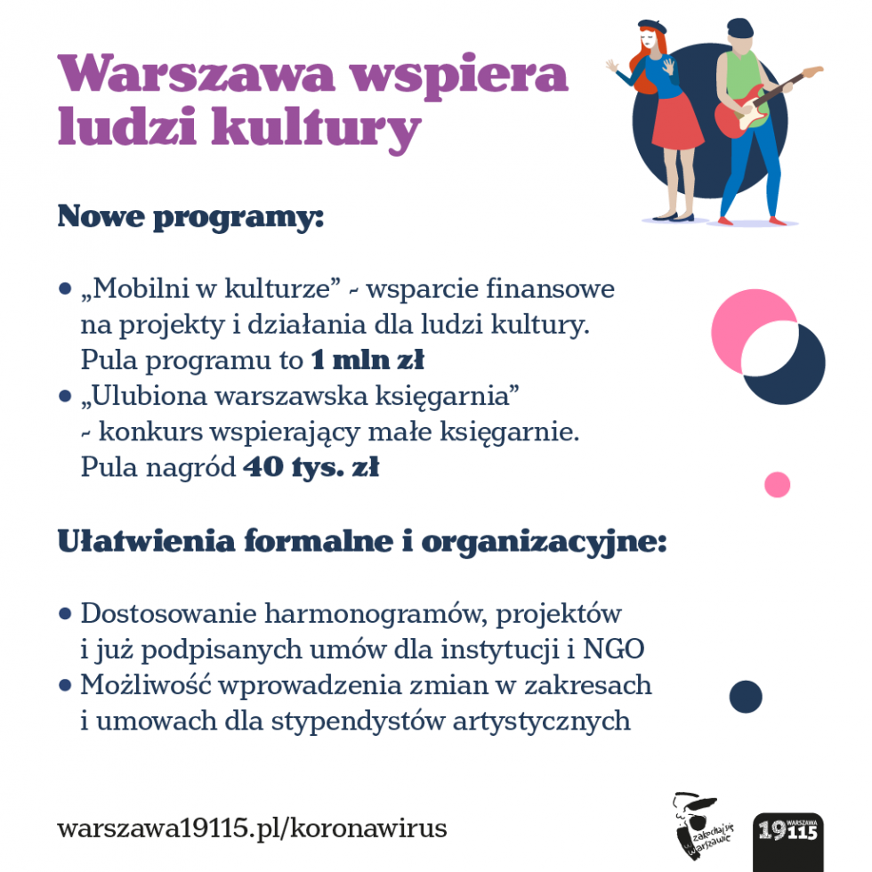 Ze względu na sytuację epidemiczną wszyscy musimy dostosować się do nowej rzeczywistości. Zamknięte placówki, odwołane wydarzenia i wstrzymane produkcje uniemożliwiają realizację projektów, zadań i wywiązywanie się z kosztorysów oraz przyjętych planów. Dlatego w tym czasie, trudnym dla instytucji kultury i organizacji pozarządowych, dla niezależnych artystów i animatorów, działających w zakresie kultury, Warszawa przygotowała szereg działań wspierających.