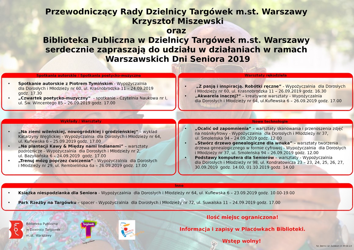 Przewodniczący Rady Dzielnicy Targówek m.st. Warszawy Krzysztof Miszewski oraz Biblioteka Publiczna w Dzielnicy Targówek m.st. Warszawy serdecznie zapraszają do udziału w działaniach, w ramach Warszawskich Dni Seniora 2019: