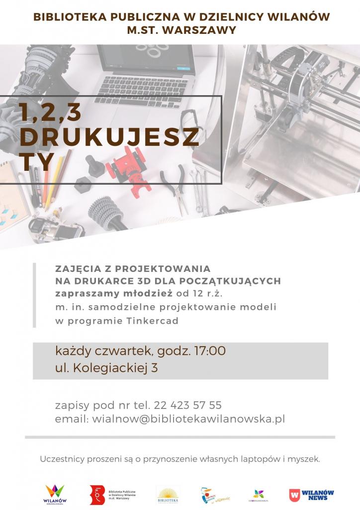 Zapraszamy cię zatem na zajęcia projektowania na drukarce 3D dla początkujących „1,2,3 drukujesz Ty”. Spotkania dla młodzieży od 12 roku życia będą odbywać się w czwartki o godzinie 17:00 w Bibliotece przy ul. Kolegiackiej 3. W czasie warsztatów uczestnicy nauczą się obsługiwać program Tinkercard, poznają rodzaje filamentów oraz zaprojektują i wydrukują wymyślony przez siebie projekt. Uczestnicy proszeni są o przyniesienie własnych laptopów i myszek.