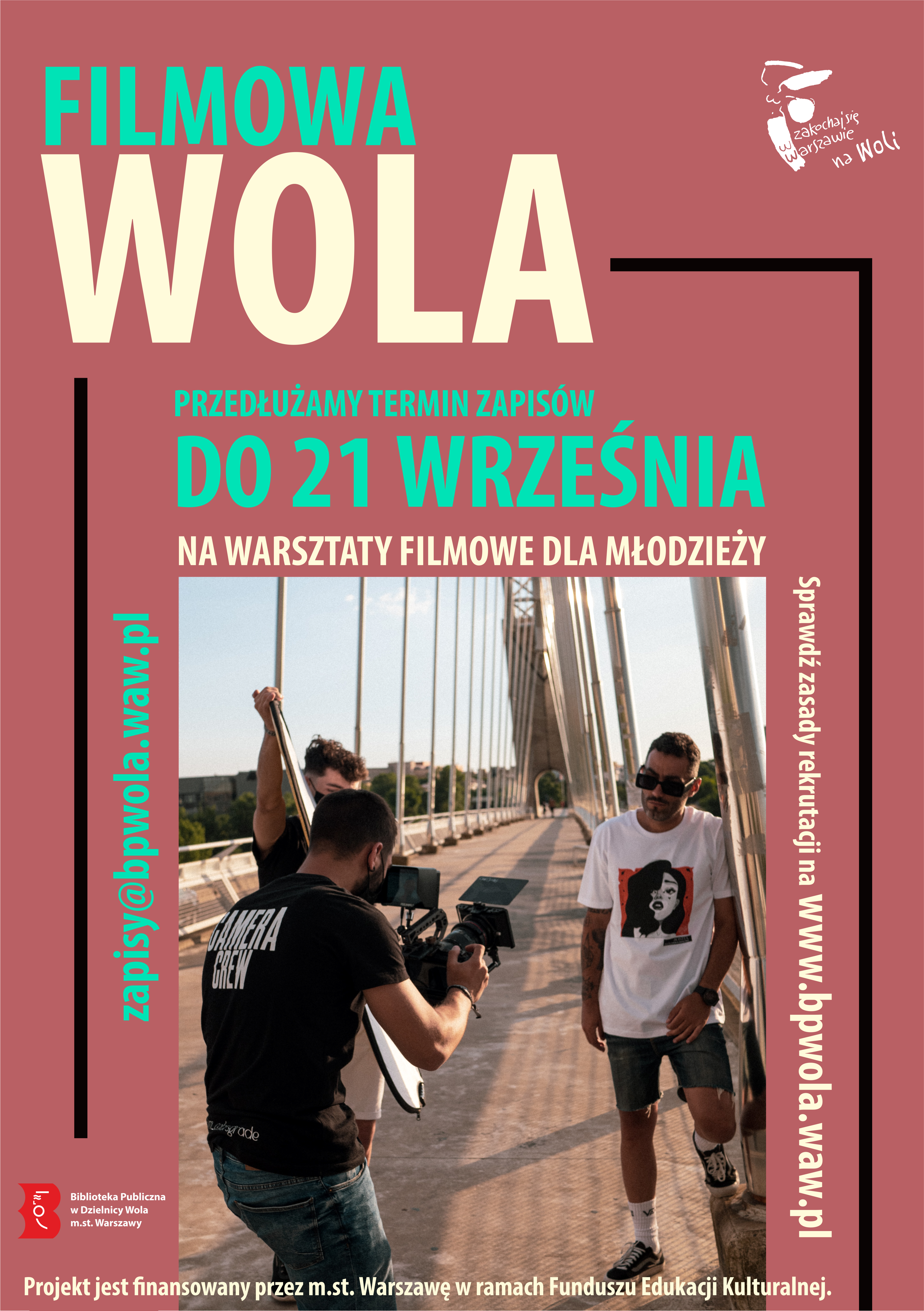 Zapraszamy młodzież w wieku 14-18 lat na bezpłatne warsztaty filmowe pod hasłem „Filmowa Wola”. Pod okiem specjalisty od filmów i edukatora młodzież będzie poznawać tajniki sztuki filmowej.