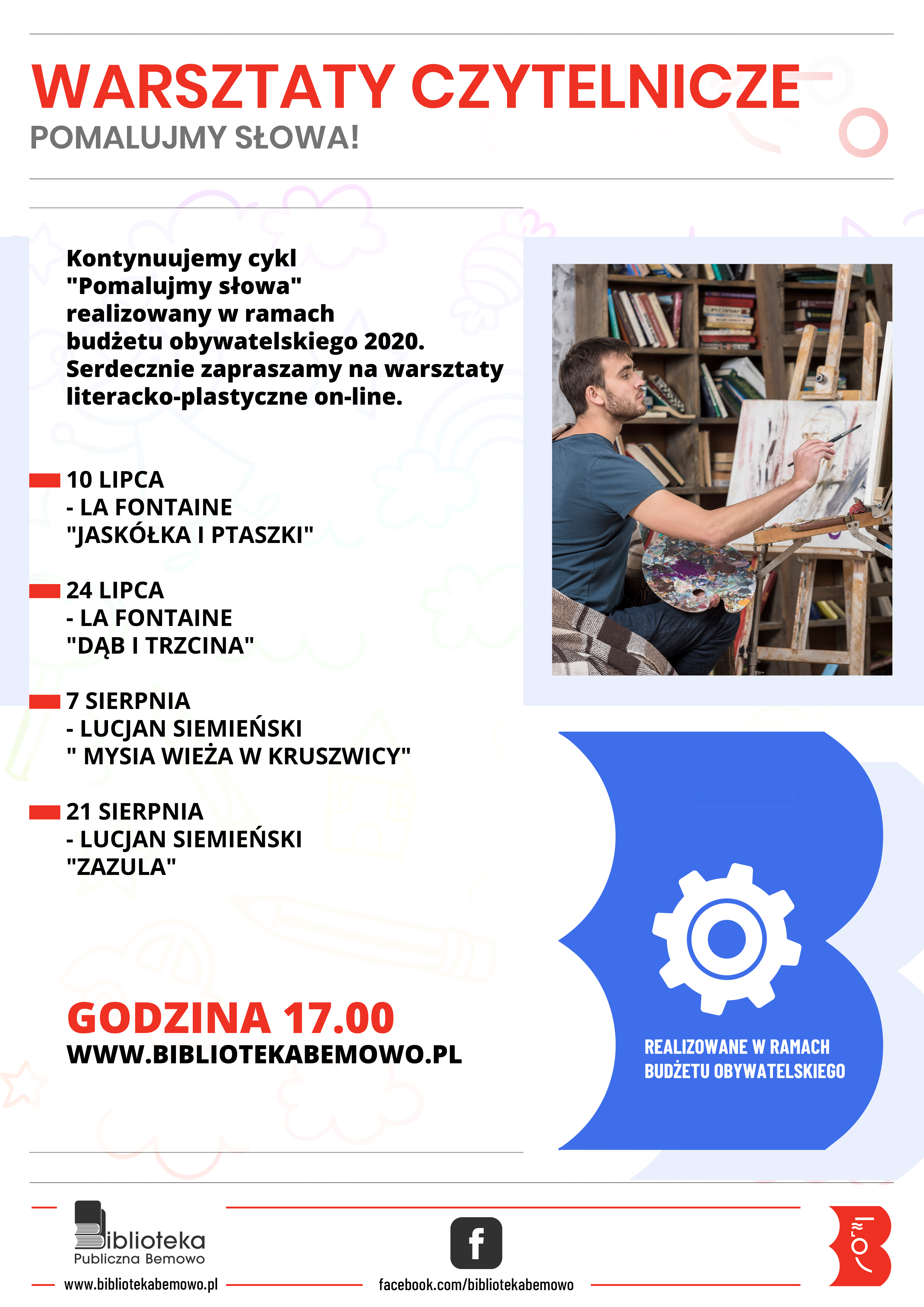 Kontynuujemy literacko-plastyczny cykl “Pomalujmy słowa” realizowany w ramach Budżetu Obywatelskiego 2020. Warsztaty odbywają się on-line. Podczas każdego spotkania nasi bibliotekarze czytają wybraną książkę oraz zaproponują zabawę plastyczną związaną z jej tematem. Serdecznie zapraszamy!