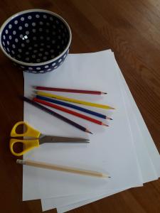 1. Przygotuj kartki papieru, ołówek, kredki, miseczkę i nożyczki.