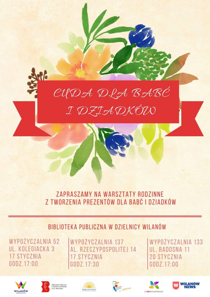Biblioteka Publiczna w Dzielnicy Wilanów zaprasza dzieci i rodziców na warsztaty rodzinne „Cuda dla Babć i Dziadków”. Pragnąc uczcić tak ważne święto jak Dzień Babci i Dzień Dziadka wykonamy prezenty dla dziadków oraz piękne laurki. Staną się one dodatkiem do płynących z serca życzeń i wdzięczności za miłość, ciepło i obecność naszych bliskich.