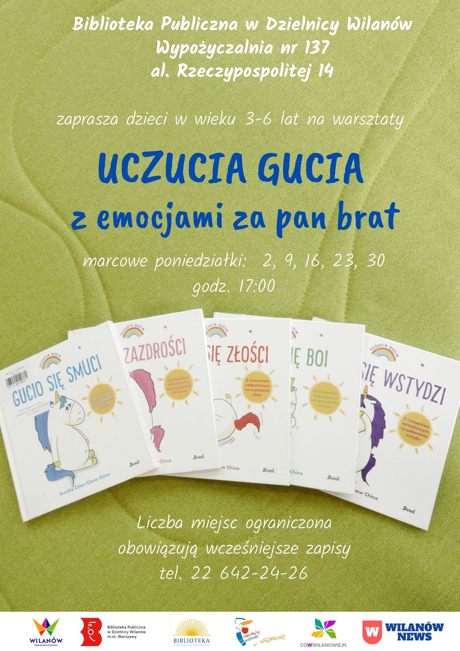 Zapraszamy zatem na warsztaty „Uczucia Gucia – z emocjami za pan brat”, które będą odbywać się w marcu w filii Biblioteki w Miasteczku Wilanów (al. Rzeczypospolitej 14). W każdy poniedziałek o godzinie 17:00 będziemy poznawać przygody bohatera książek Aurélie Chien Chow Chine i kolejne emocje oraz uczucia. Na spotkania zapraszamy dzieci w wieku 3-6 lat. Zapisy na zajęcia prowadzimy pod numerem telefonu 22 642 24 26. Liczba miejsc jest ograniczona. Zachęcamy do wspólnej przygody w fascynującym świecie naszych przeżyć wewnętrznych.