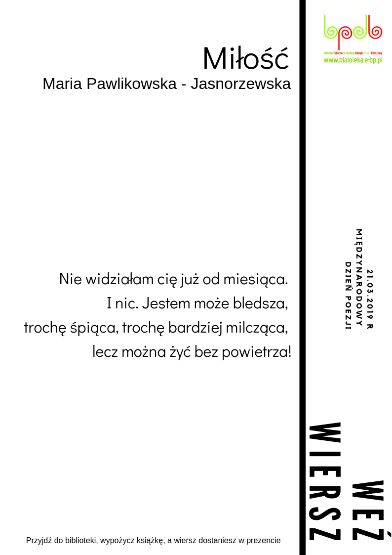 W tym roku z przyjemnością włączamy się w promocję poezji. Każdy czytelnik, który przyjdzie 21 marca do biblioteki na Białołęce, otrzyma wiersz w prezencie.