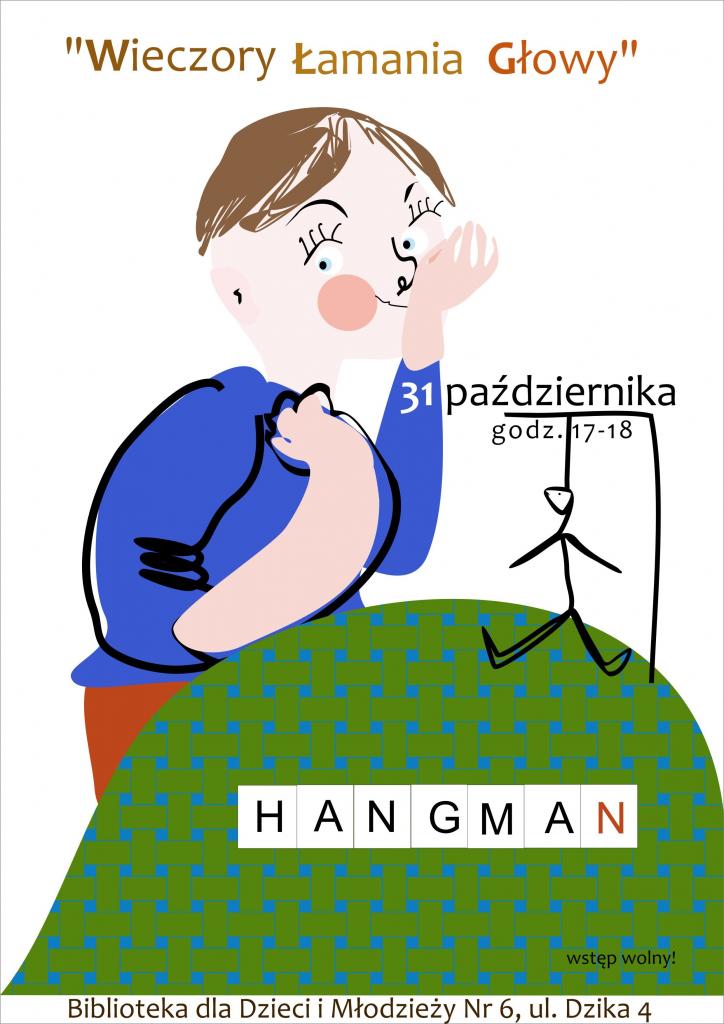 Zapraszamy w czwartek 31 października o godzinie 17:00 do Biblioteki dla Dzieci i Młodzieży nr 6 przy ulicy Dzikiej 4 na spotkanie pt. „Hangman” z cyklu „Wieczory Łamania Głowy”. To cykl spotkań, na których bawimy się we wszelkiego rodzaju łamigłówki logiczne, gry i zabawy w oparciu o książki bądź gry planszowe.
